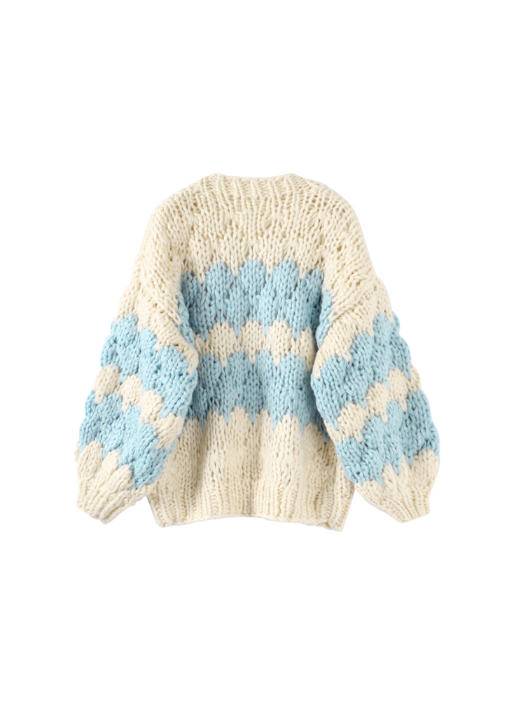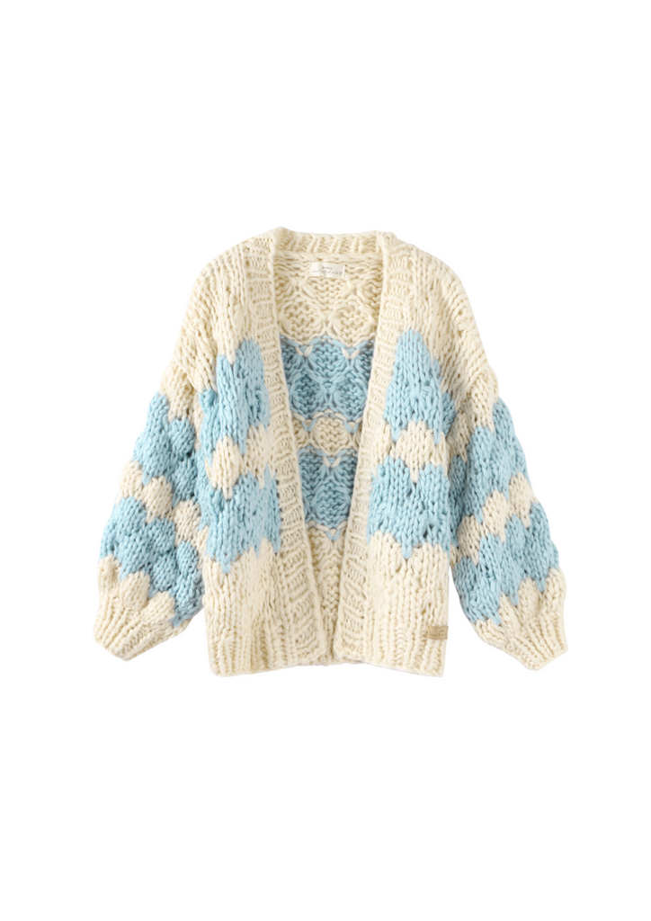 Soft, dreamy, and effortlessly elegant - the Cloud Nine Hugs and Kisses Cardigan is your ultimate cosy companion. Handmade with love, this chunky knit cardi features a cropped silhouette, balloon sleeves, and a serene mix of cream and light blue tones. Light as air yet perfectly snug, it’s the kind of piece that makes every day feel a little more heavenly.