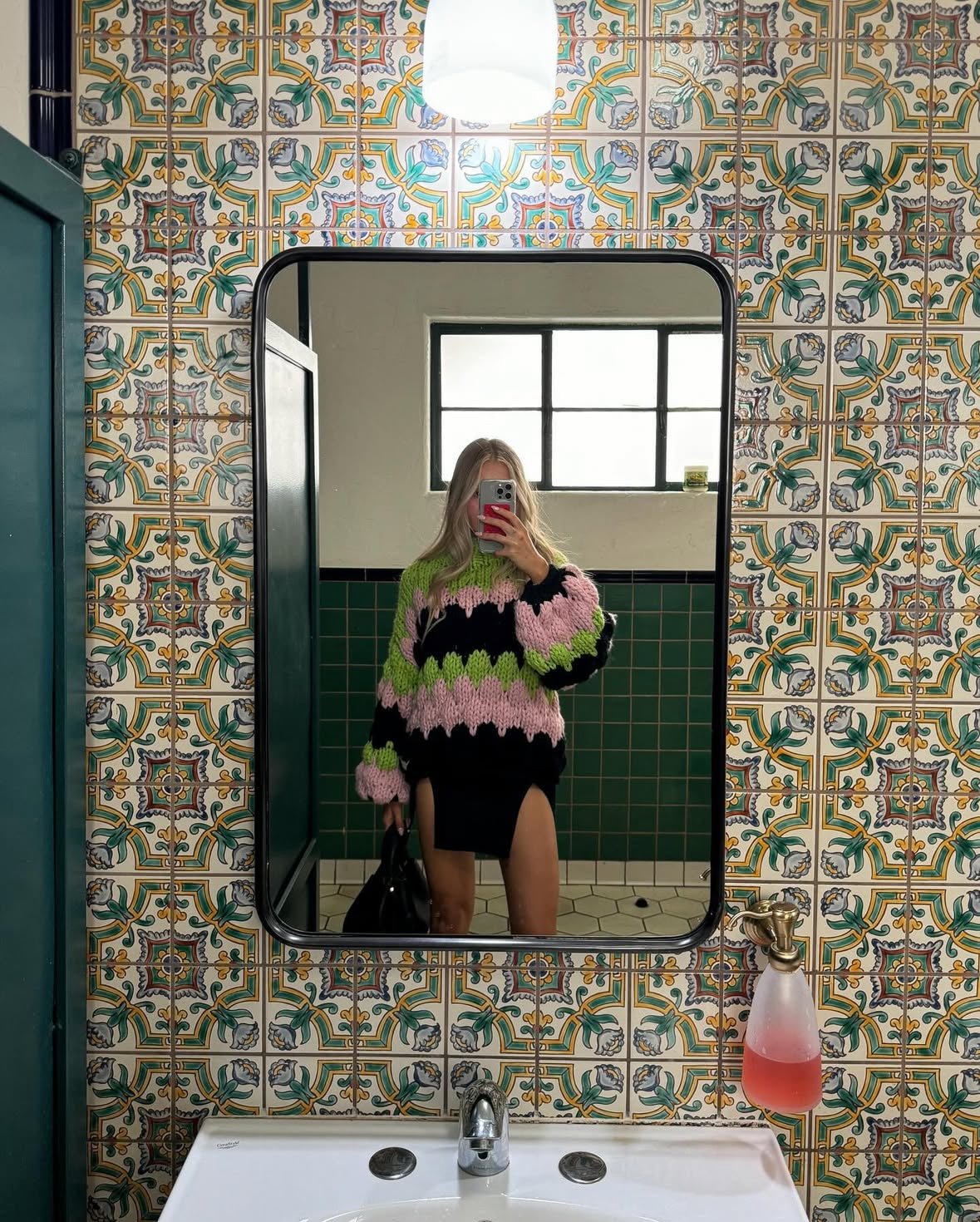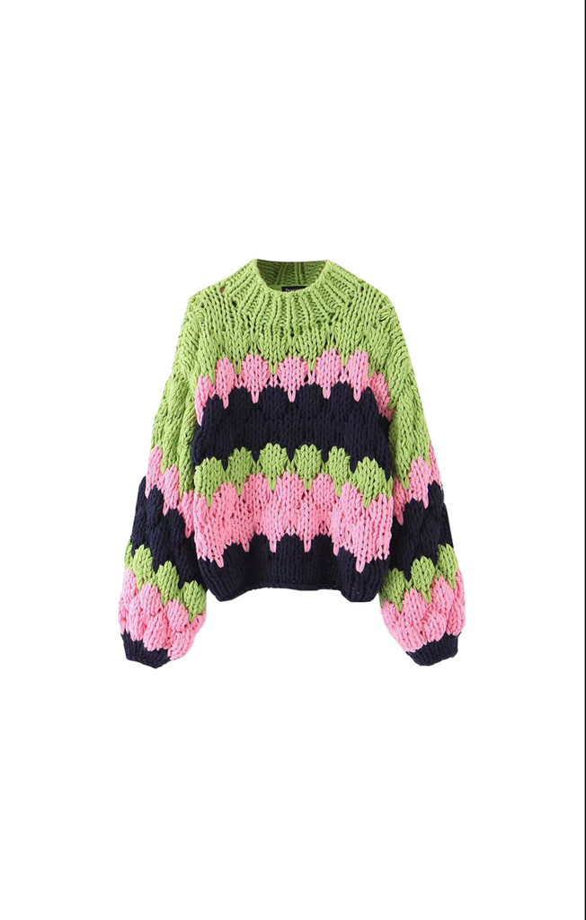 Stay warm and stylish with this hand knitted Sweetheart Chunky Knit Jumper. This vibrant jumper, completed with balloon sleeves exudes a fun and flirty style.